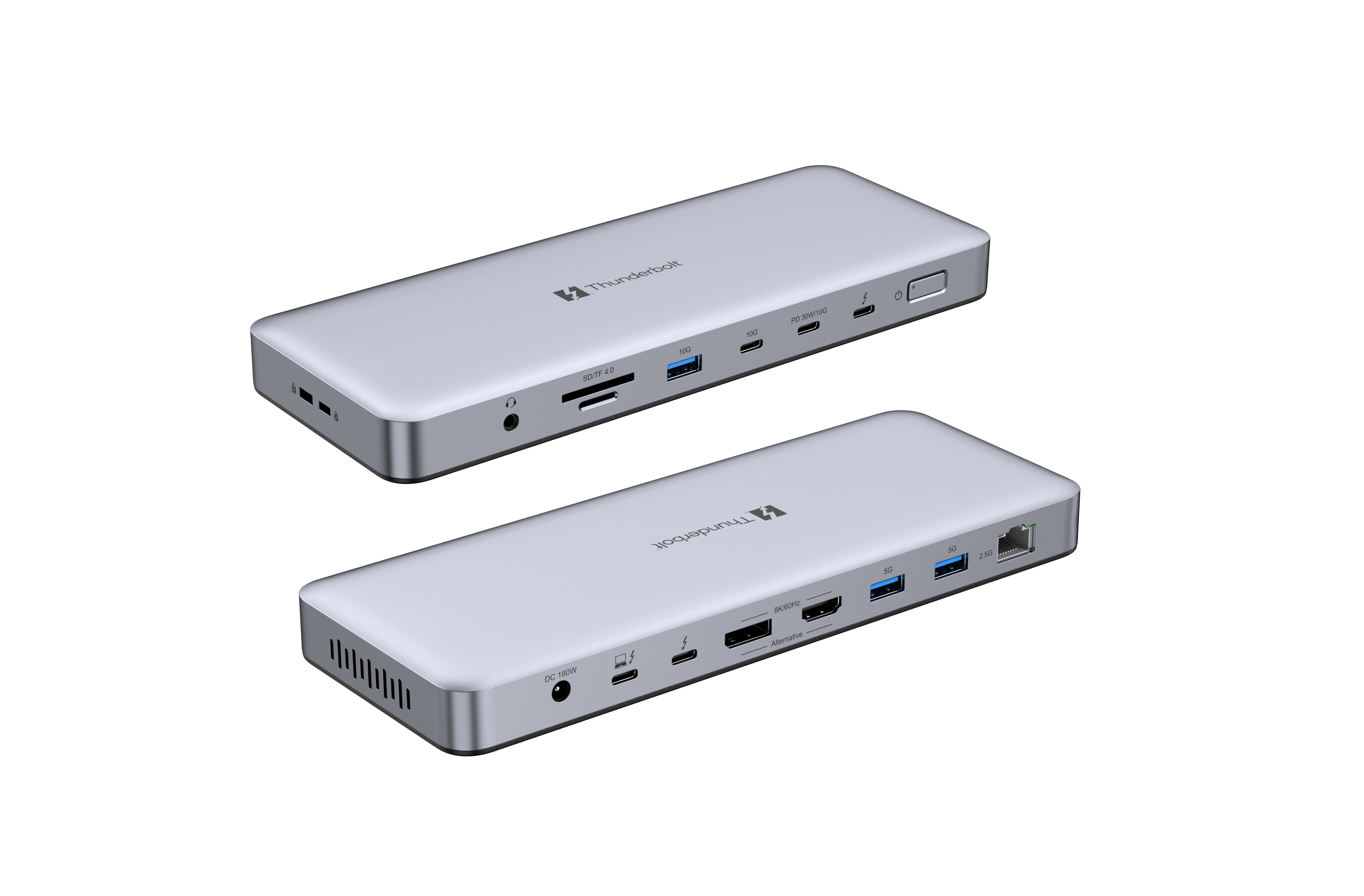 USB-C 10G x2(one supports PD 30W output),USB-A 10G x1,USB-A 5G x2,SD/TF 4.0 x1(312MBps),RJ45 x1(2.5G),3.5mm Audio Jack x1(384KHz),DC Power Jack x1(180W)