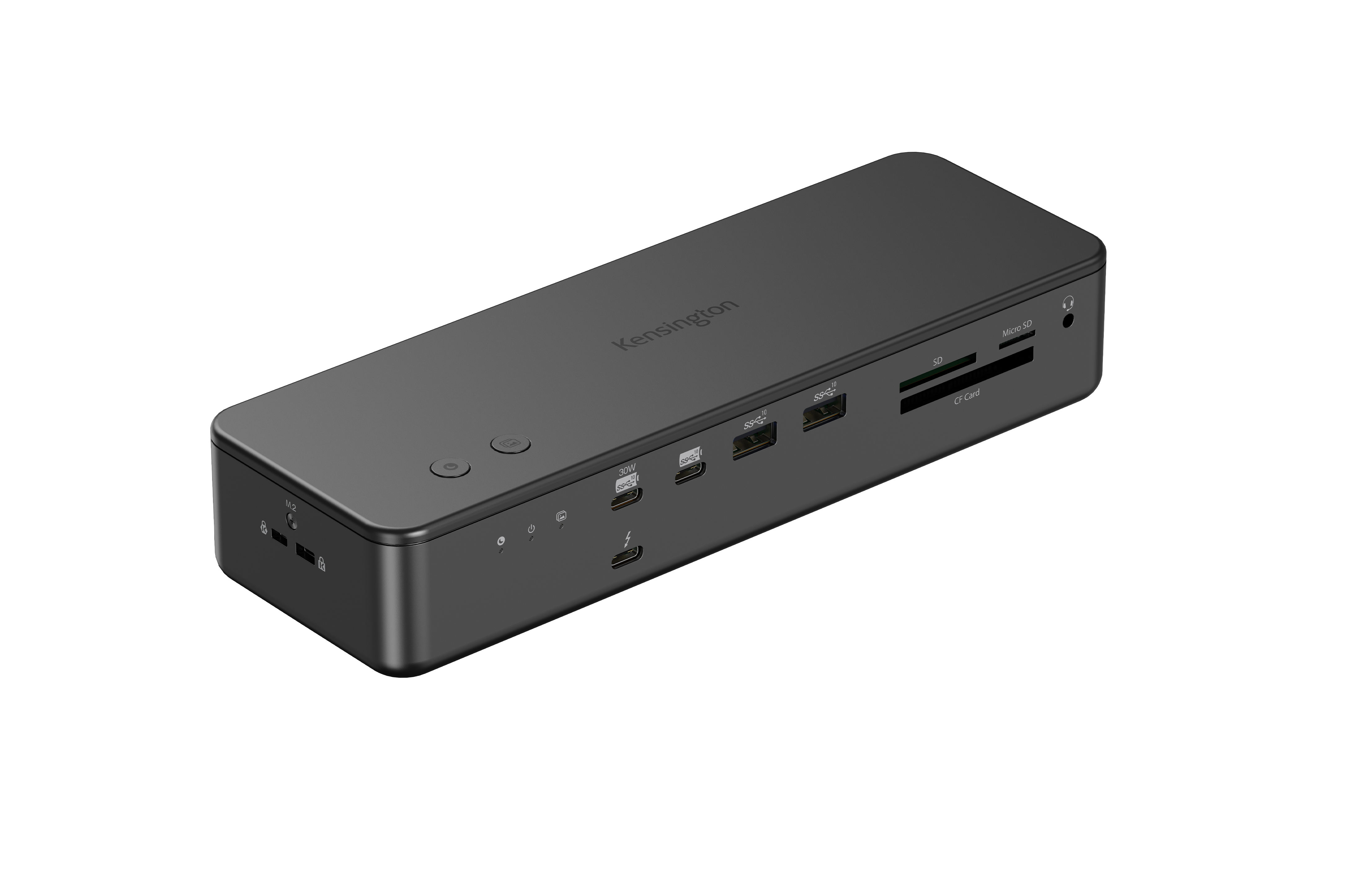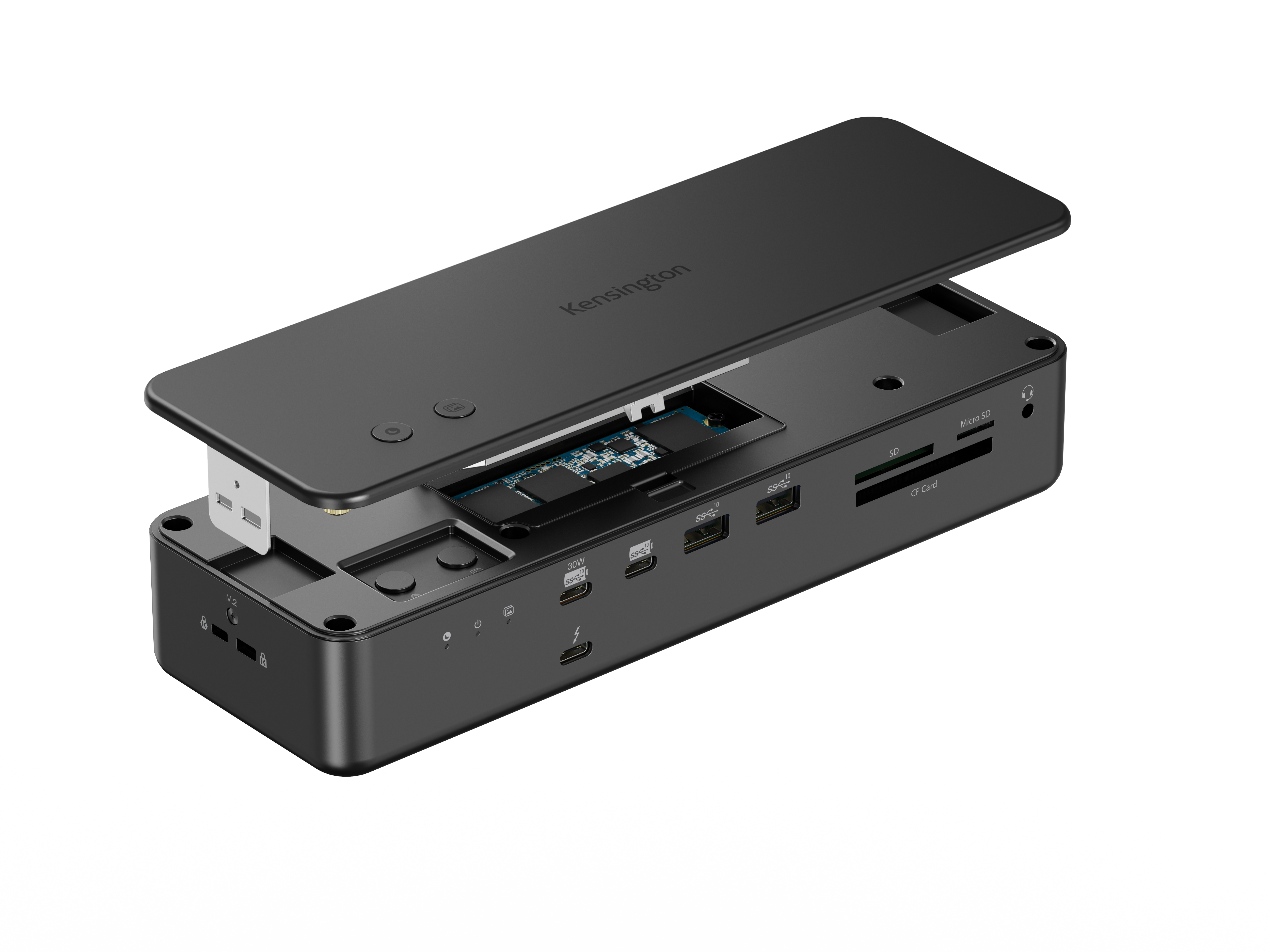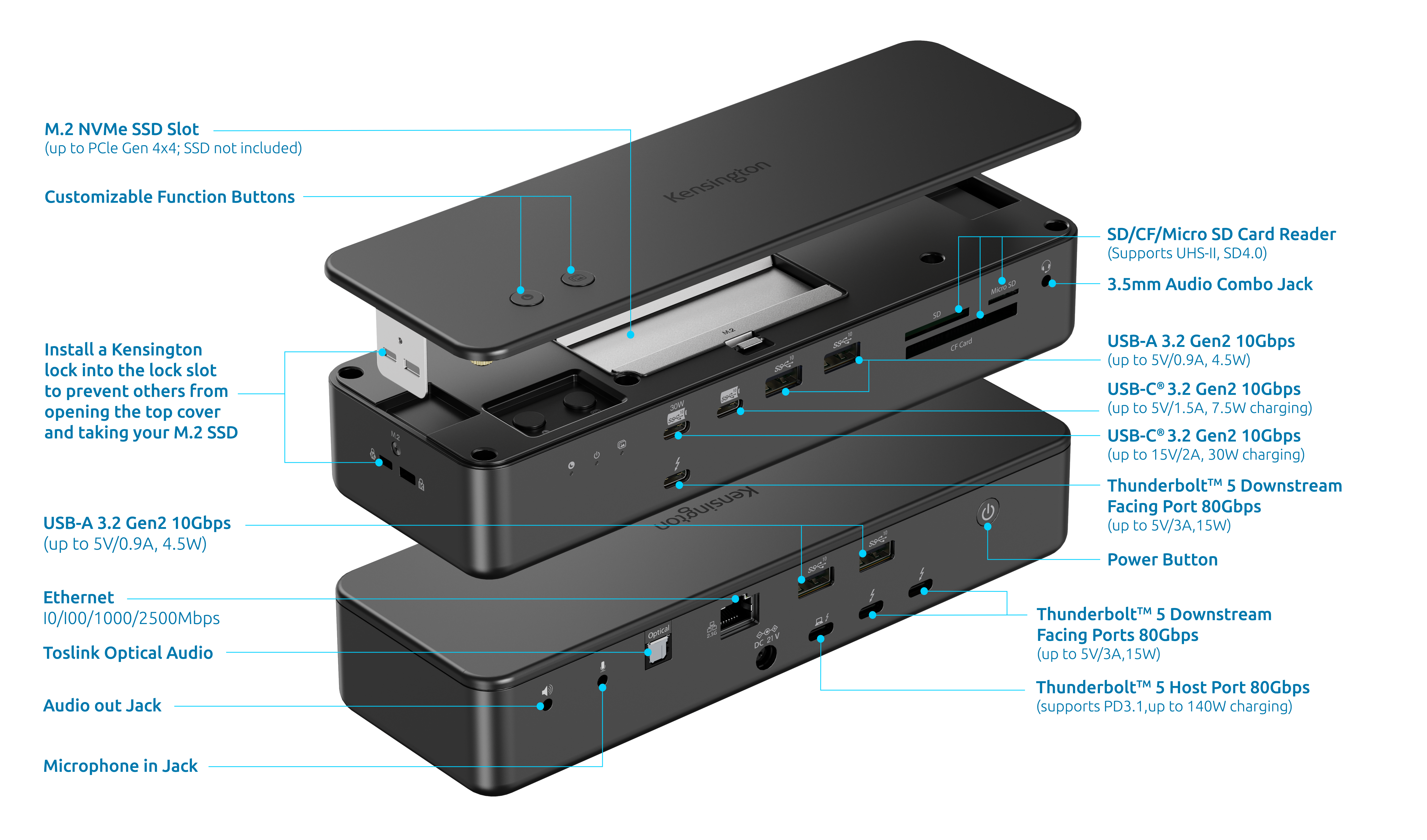 Unique features include a builti-in and patent-pending lockable PCle M.2 SSD slot for quick storage expansion, triple CF/SD/Micro SD card readers, and two patent-pending iPhone Photo Backup, Focus Mode or 80+ customizable function options buttons, making it ideal for creative professionals and content creators. This single-cable solution delivers up to 140W power to the laptop and connected accessories, supports up to two 6K displays, and delivers 80Gbps bi-directional bandwidth. No clutter, no hassle — just maximum efficiency.