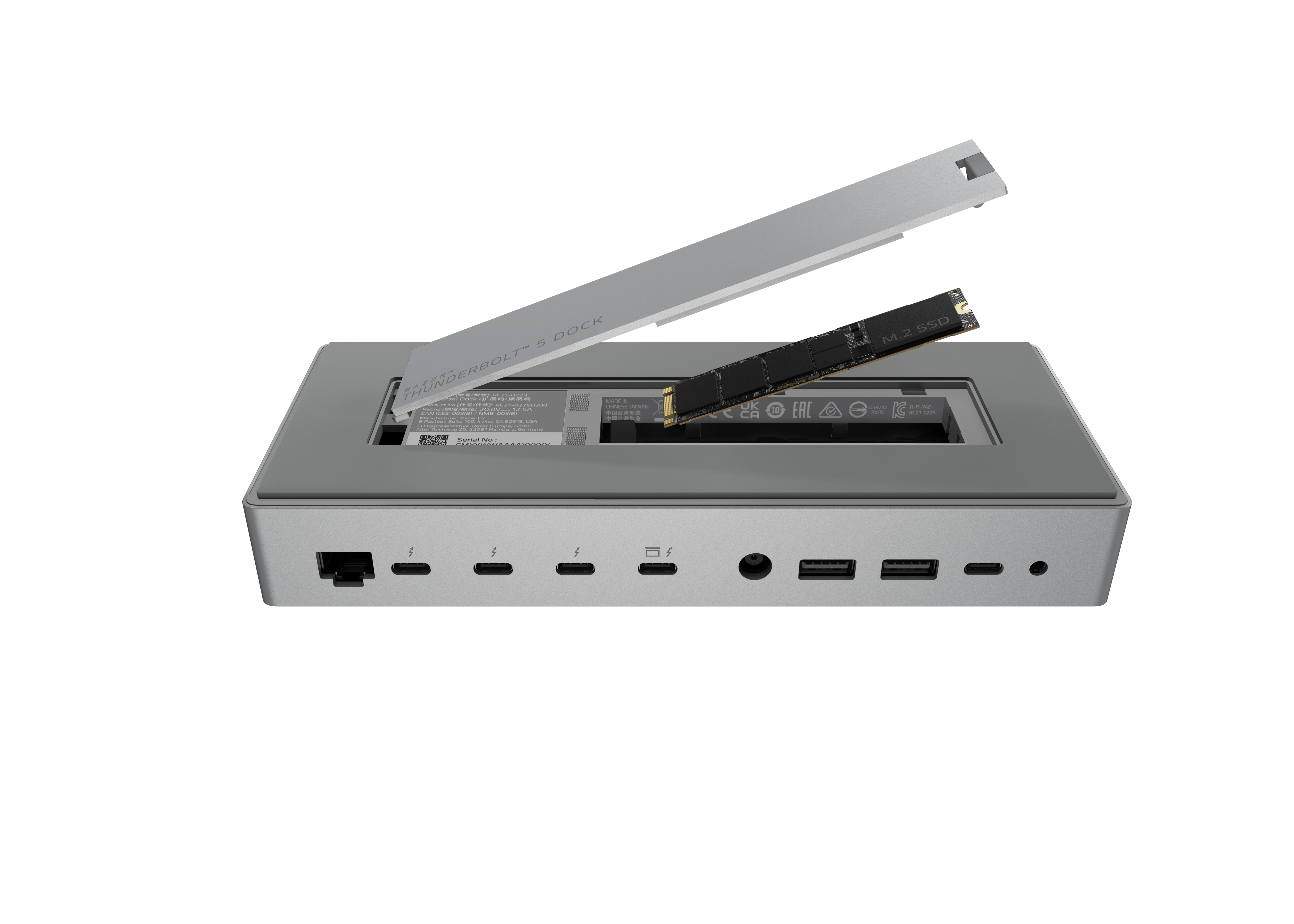 Features multiple Thunderbolt™ 5 ports, Gigabit Ethernet, a 3.5 mm audio combo jack, a UHS-II SD Card Slot, USB Type A 3.2 Gen 2 ports, and a storage slot for ultra-fast M.2s.